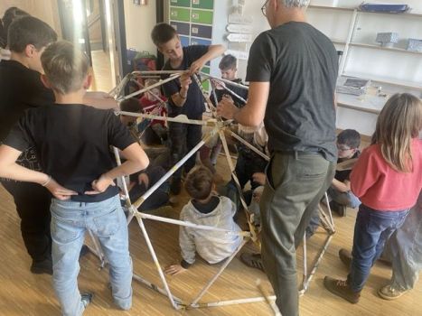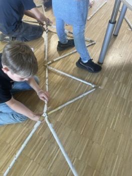 In der Werkstatt rund ums Thema Papier haben wir eine sog. geodätische Kuppel gebaut, auch Geodome genannt. Dazu haben die Kids über 70 Rollen aus Zeitungspapier hergestellt und mit Klammern zu einer Kuppel verbunden. Alle Hände und auch Köpfchen waren gefragt, und die Kids waren mit Feuereifer am Werk. Am Ende haben sogar fast alle in die Kuppel gepasst.