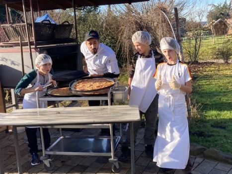 Wir haben vier Gruppen, die sich jeweils mit den Diensten abwechseln. Am Dienstag war die rote Gruppe in der Küche und hat mit Edi (unserem Koch) Pizza gebacken. Die blaue Gruppe war in der Molkerei und hat Käse gemacht, die grüne Gruppe war im Garten und bei den Hühnern und die gelbe Gruppe hat im Stall bei den Tieren gemistet. Diese Dienste wechseln immer durch, so dass alle mal an jeder Stelle mitgearbeitet haben.