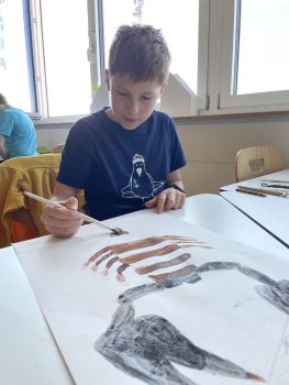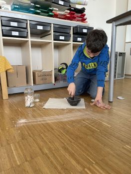 Die Mittelgruppen hatten vor Ostern das Werkstatt-Thema FARBE. In einer Gruppe haben wir verschiedenfarbige Gesteine und Erden zunächst zu Farbpigmenten gemahlen und gesiebt. Mit Kleister als Bindemittel haben wir die Pigmente zu Farbe angerührt.