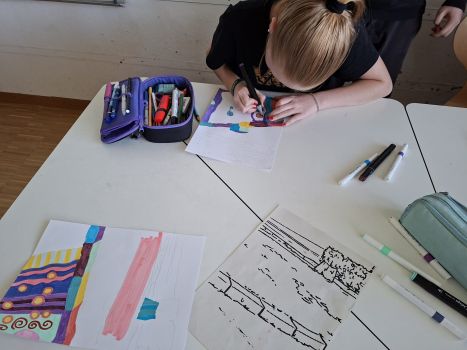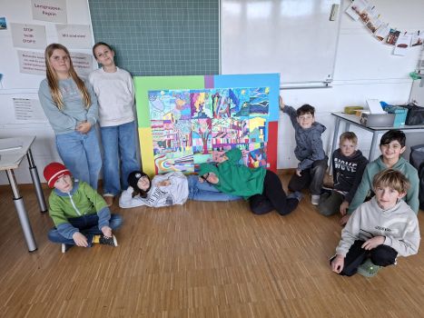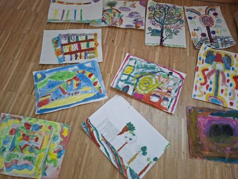 Die Mittelgruppen haben sich mit den Kunstwerken von Friedensreich Hundertwasser beschäftigt und unser Schulhaus im typischen Stil gemalt.