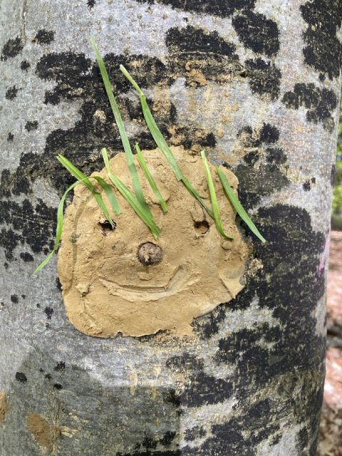 Auch am 2. Tag hatten die Untergruppen-Kinder Sonnenschein mit bester Laune. Beim Waldkochen, Blind-Parcour, Lehmgesichter gestalten und Schnitzen waren alle voller Eifer dabei. Viele Wald-Shops wurden aufgerüstet und so konnten Lehmkugeln gegen Tannenzapfen getauscht werden. Wunderschöne Lager sind entstanden und der Barfuß-Pfad ist fast fertig. Am Nachmittag wanderten alle zum Grillplatz Schwanholz. Dank der Vorbereitungen durch unsere Küche gab es eine leckere Grillerei für alle. Die Schlucht in Nehren ist voller Wasser - man kann sich vorstellen, wie manche Kids ausgesehen haben.