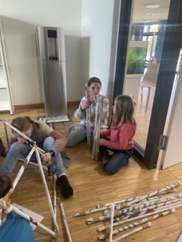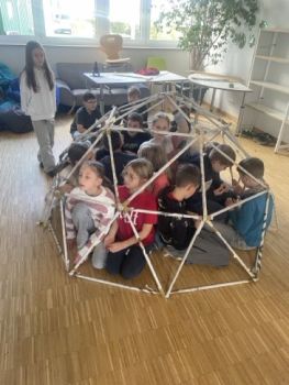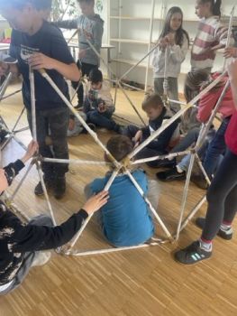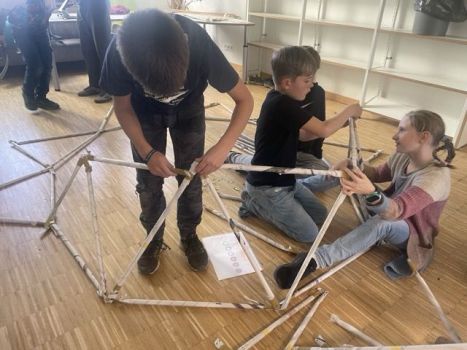In der Werkstatt rund ums Thema Papier haben wir eine sog. geodätische Kuppel gebaut, auch Geodome genannt. Dazu haben die Kids über 70 Rollen aus Zeitungspapier hergestellt und mit Klammern zu einer Kuppel verbunden. Alle Hände und auch Köpfchen waren gefragt, und die Kids waren mit Feuereifer am Werk. Am Ende haben sogar fast alle in die Kuppel gepasst.