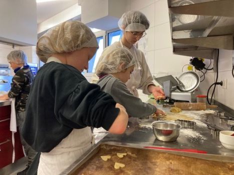 Wir haben vier Gruppen, die sich jeweils mit den Diensten abwechseln. Am Dienstag war die rote Gruppe in der Küche und hat mit Edi (unserem Koch) Pizza gebacken. Die blaue Gruppe war in der Molkerei und hat Käse gemacht, die grüne Gruppe war im Garten und bei den Hühnern und die gelbe Gruppe hat im Stall bei den Tieren gemistet. Diese Dienste wechseln immer durch, so dass alle mal an jeder Stelle mitgearbeitet haben.