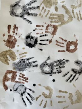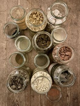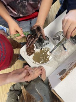 Die Mittelgruppen hatten vor Ostern das Werkstatt-Thema FARBE. In einer Gruppe haben wir verschiedenfarbige Gesteine und Erden zunächst zu Farbpigmenten gemahlen und gesiebt. Mit Kleister als Bindemittel haben wir die Pigmente zu Farbe angerührt.