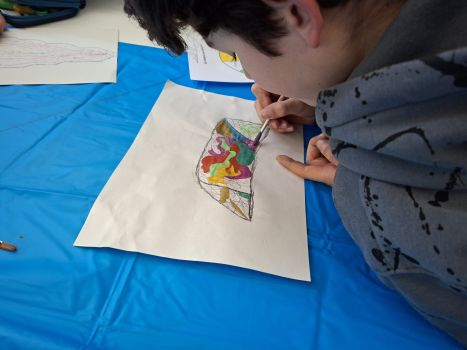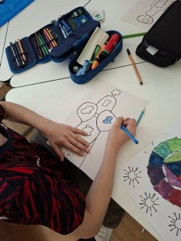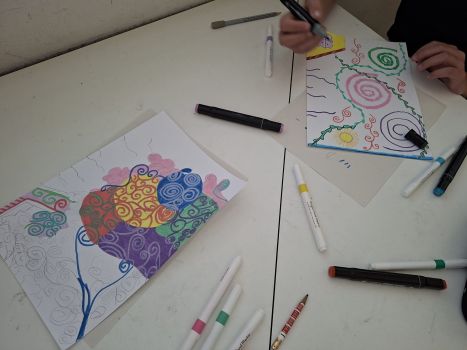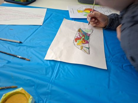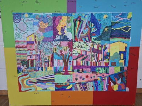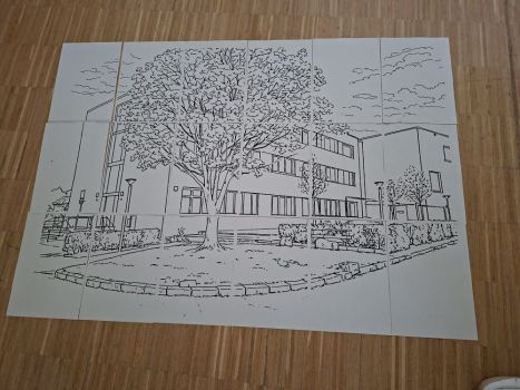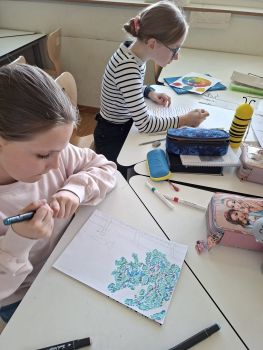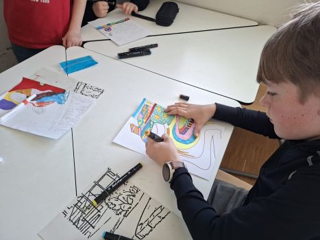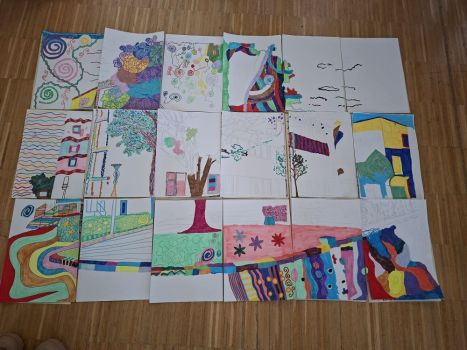 Die Mittelgruppen haben sich mit den Kunstwerken von Friedensreich Hundertwasser beschäftigt und unser Schulhaus im typischen Stil gemalt.